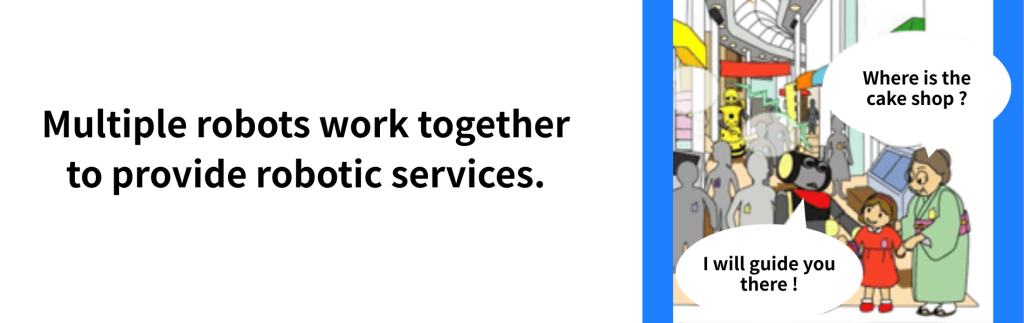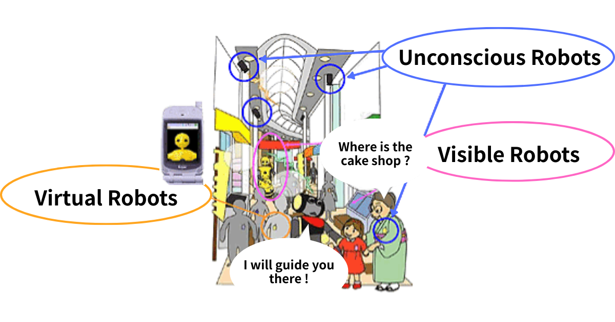 - Linking visible robots with virtual robots (such as agents) and unconscious robots (such as cameras or tags) enables the implementation of advanced dialogue technology in stations, science museums, shopping malls, and other locations. This technology allows robots to adapt their speech patterns and gestures based on environmental conditions and human behavior.
