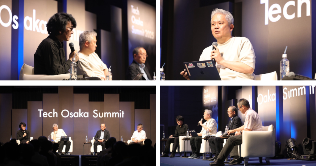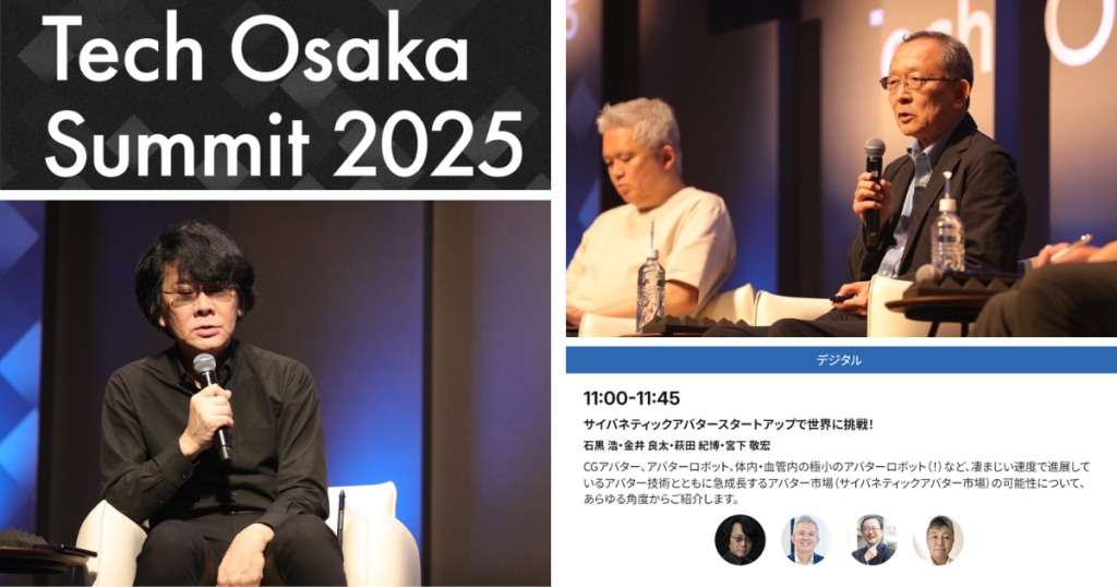 グランフロント大阪 コングレコンベンションセンターで同時開催されていた Tech Osaka Summit 2025 では、トークセッション「サイバネティックアバタースタートアップで世界に挑戦!」に、萩田 紀博(PD)・石黒 浩(PM)・金井 良太(PM)・宮下 敬宏の4名が登壇し、様々なアバターとその技術、アバター市場について紹介しました。